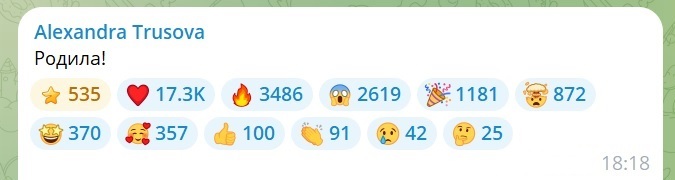 Радостная новость появилась 6 августа в 18:18 в её официальном ТГ Канале с короткой подписью: "РОДИЛА!".