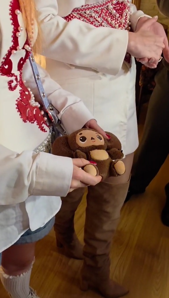 Так же одна из солисток показала русскую игрушку - Чебурашку, которую носит с собой, вместо модной нашумевшей игрушки Labubu.