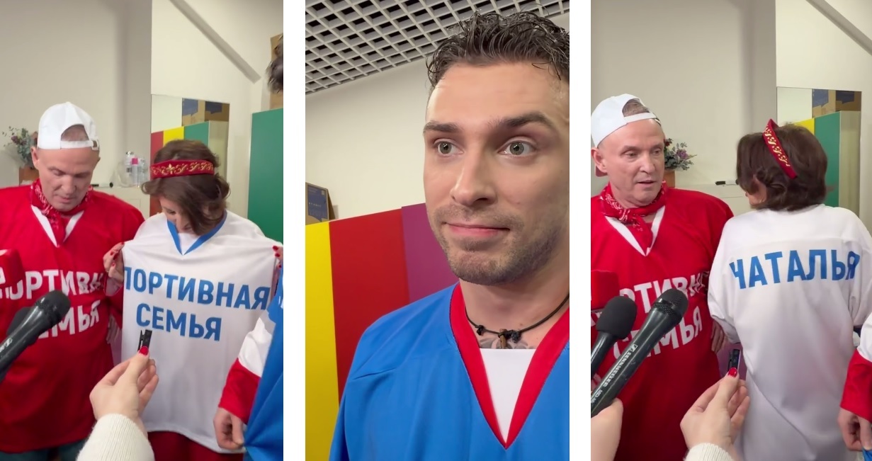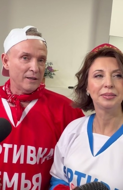 Виктор Рыбин вышел в компании своей супруги Натальи Сенчуковой и сына Василия, на футболках которых была надпись "Спортивная семья".