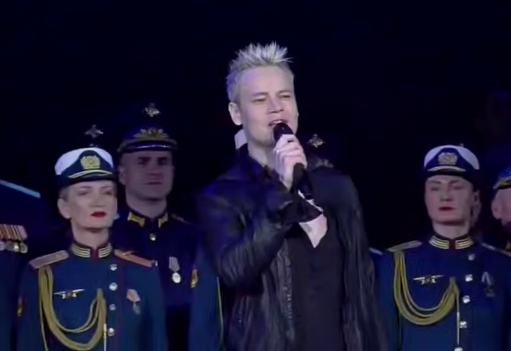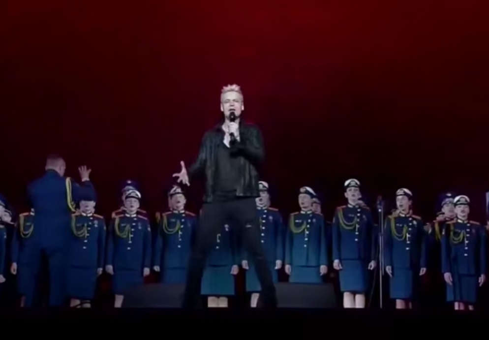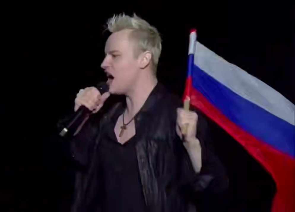 Затем оставил в руке российский флаг и начал исполнение композиции, в которой звучат патриотичные слова: